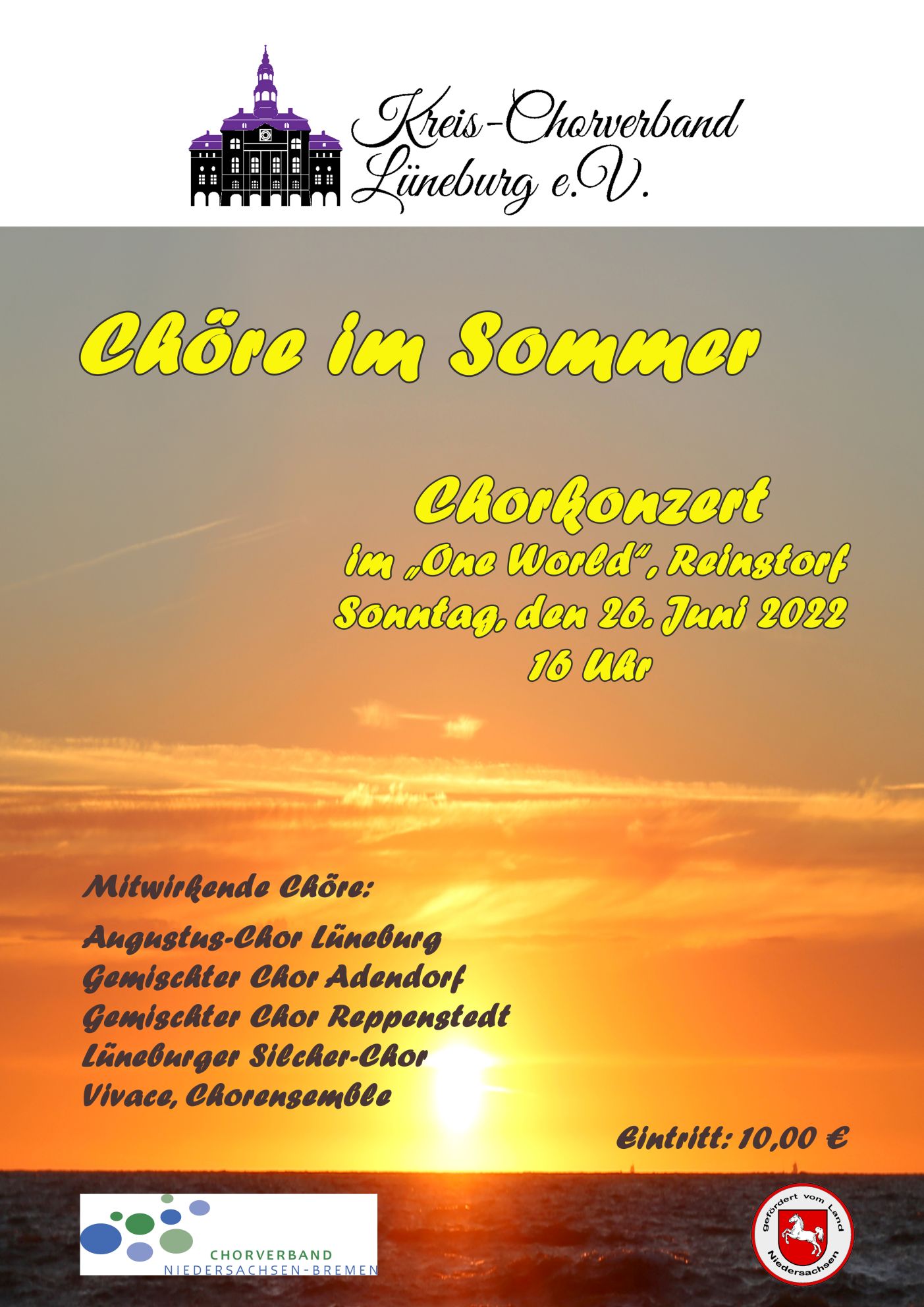 Kulturforum Wienebüttel Wienebütteler Weg, LüneburgEin Chorkonzert mit Schwerpunkt Rock und Pop. Der Lüneburger Silcher-Chor wird dieses Konzert mit zwei Liedern eröffnen. Eintritt s. Plakat und Webseite des Kulturforums Wienebüttel